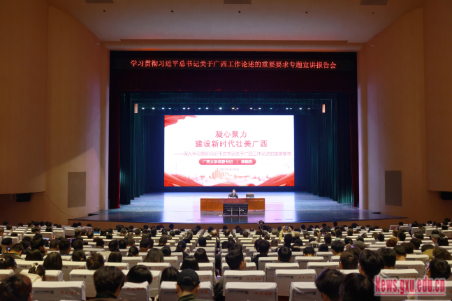 宣講報告會以習近平新時代中國特色社會主義思想為指導,全面回顧了習近平總書記對廣西發展的關心關懷故事,深入解讀了習近平總書記關于廣西工作論述的重要要求的主要精神、內容體系,系統闡述了自治區黨委、政府全面貫徹落實重要要求的系列部署,結合廣西大學主動服務國家戰略、服務壯美廣西建設的生動實踐,向全校領導干部、青年師生發出了實干創新的倡議。