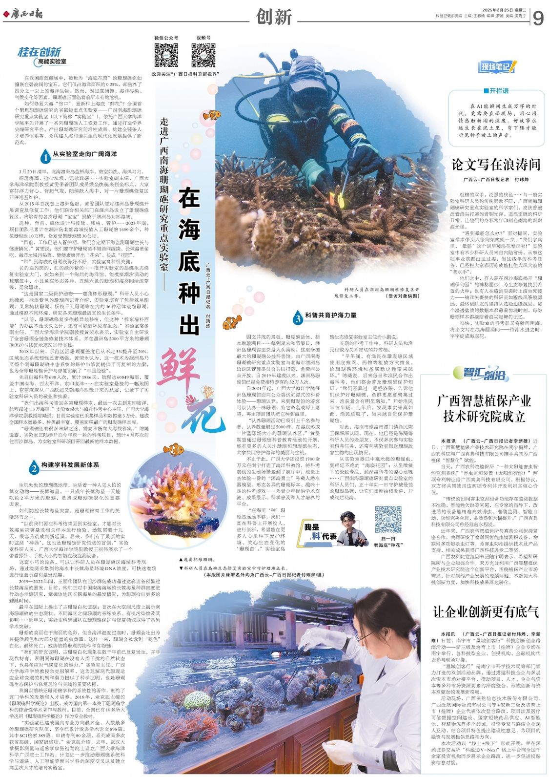 如何修復大海“傷口”,重新種上海底“鮮花”?全國首個聚焦珊瑚礁研究的省部級重點實驗室——廣西南海珊瑚礁研究重點實驗室(以下簡稱“實驗室”),依托廣西大學海洋學院率先開展了一系列珊瑚礁人工修復工作,通過打造學界尖端研究平臺、產出珊瑚礁研究前沿性成果、構建全鏈條人才培養體系等,為構建人海和諧共生的現代化發展提供了新范式。