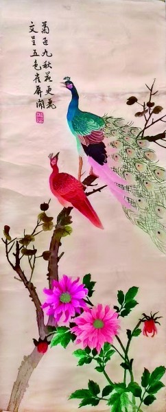 這四條屏湘繡將中國傳統(tǒng)的繪畫、刺繡、詩詞、書法、金石藝術融為一體。每幅都是精心搭配的花鳥圖,之間形成呼應,上面所繡詩句也并非拾人牙慧,而是緊扣畫意獨創(chuàng)。四條屏未標次序,然而,根據(jù)鳳為皇后專屬,明清文官補子一品為仙鶴,三品為孔雀,似可將其以鳳凰、仙鶴、孔雀、雄鷹為序。第一幅為鳳凰與牡丹:“彩鳳雙棲夸艷福 名花競放喜連枝”,此詩雖表面未寫牡丹,實際上用的卻是李白詩句的典故。《楊妃外傳》稱:“開元中,禁中初重木芍藥,即今牡丹也。得數(shù)本紅紫、淺紅、通白者,上移植于興慶池東沉香亭前。”唐明皇命李白賦詩稱贊楊貴妃之美,李白寫下著名的三首《清平調》,其中之一分別以“名花”和“傾國”代稱牡丹和楊貴妃,“名花傾國兩相歡,常得君王帶笑看。解釋春風無限恨,沉香亭北倚闌干。”第二幅為仙鶴與月季:“鶴舞青松同不老 花榮四季得春長”。其中以“四季”點月季,又與“吉”諧音,而且仙鶴長壽,月季長春,可謂相得益彰。第三幅為孔雀與大麗花:“菊迎九秋花更麗 文呈五色雀屏開”。此詩用的是唐高祖李淵“雀屏中選”的典故,竇毅命求婚者每人射兩箭,誰能射中屏上孔雀雙眼,就把女兒許配給誰。《舊唐書·高祖竇皇后傳》:“乃于門屏畫二孔雀,諸公子有求婚者,輒與兩箭射之,潛約中目者許之。前后數(shù)十輩莫能中。高祖后至,兩發(fā)各中一目。”第四幅為雄鷹與凌霄:“雄鷹得意沖霄漢 浩氣凌空展壯猷”,其中用嵌字格嵌入“凌霄”,又與雄鷹搏擊長空,氣沖霄漢相輔相成。每幅題詩后用印章形式繡“湘繡”作為落款。