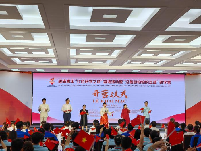 越南青年“紅色研學之旅”首場活動暨“沿著胡伯伯的足跡”研學營開營儀式18日在廣西大學舉行,約200名中越兩國各領域青年代表參加。