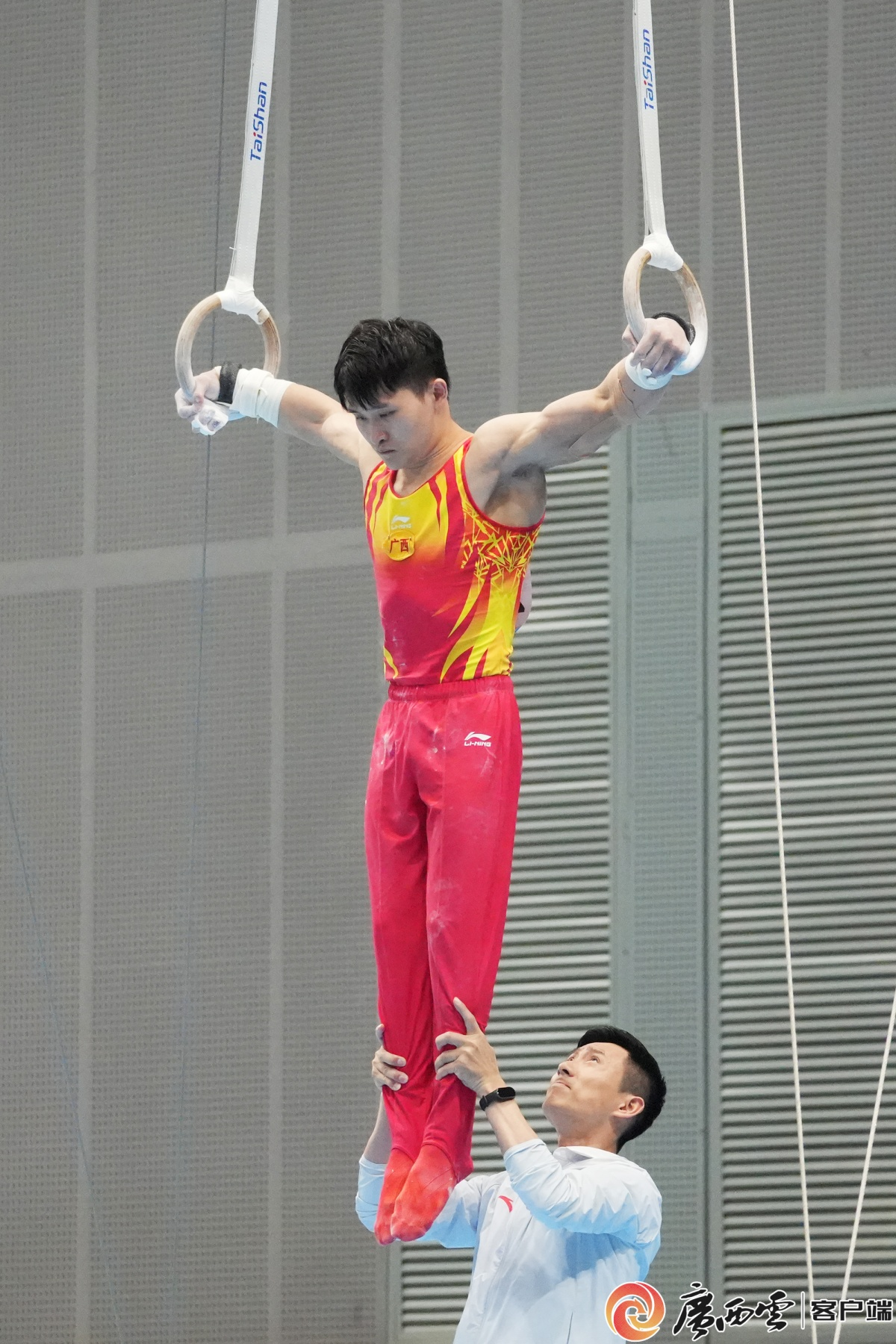 蘭星宇在工作人員幫助下即將開啟自己的強項——吊環(huán)比賽。記者 金翔義 攝