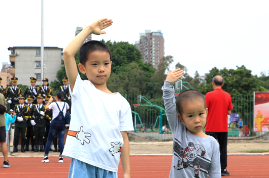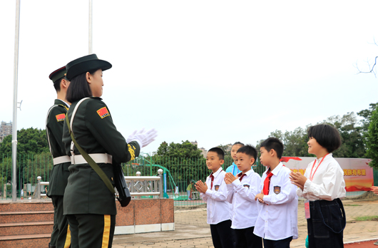 升旗儀式結(jié)束后,國(guó)旗班成員給小朋友講革命故事,小朋友向國(guó)旗敬禮。