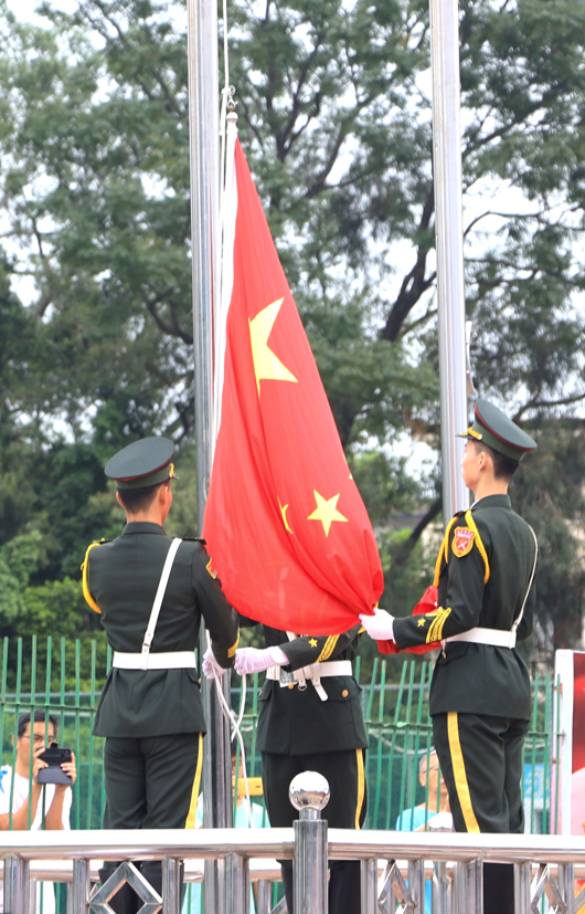 八時(shí)整,升旗儀式正式開(kāi)始。伴隨雄壯的《義勇軍進(jìn)行曲》和西大國(guó)旗儀仗隊(duì)鏗鏘的腳步聲,師生齊唱國(guó)歌,深情注目,鮮艷的五星紅旗與太陽(yáng)一同升起,高高飄揚(yáng)。
