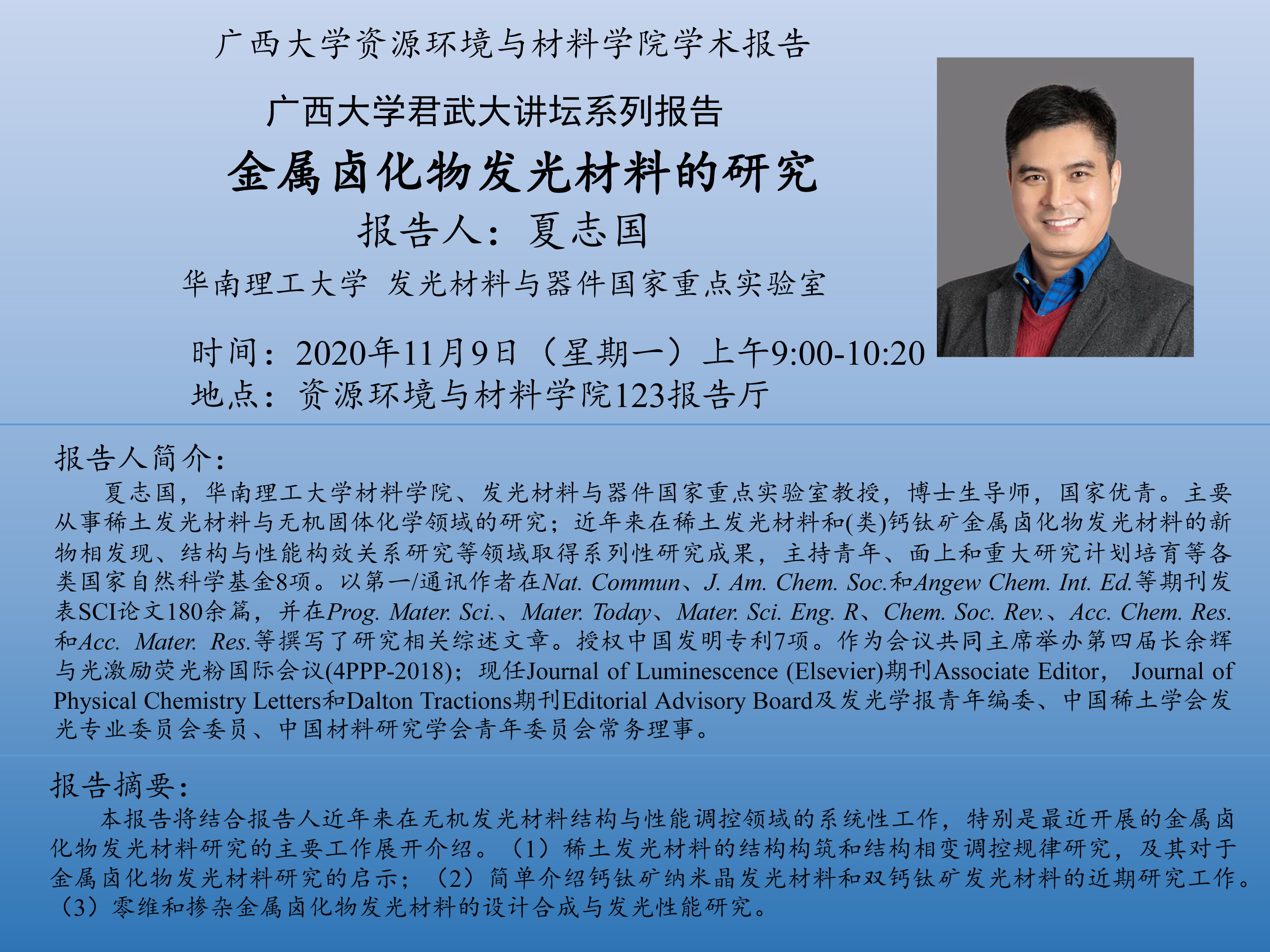 上一條:資源環(huán)境與材料學(xué)院學(xué)術(shù)報(bào)告:“廣西大學(xué)君武大講壇系列”雜化鈣鈦礦單晶生長(zhǎng)與器件