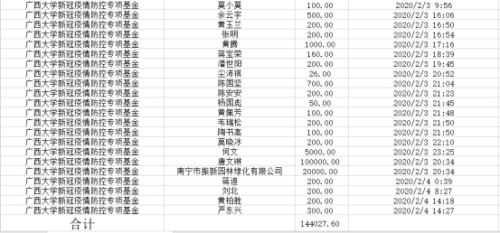 自廣西大學校友總會與教育發(fā)展基金會發(fā)布捐贈公告以來,截至2020年2月4日晚上7點整,基金會共接受捐贈45筆,具體明細如下: