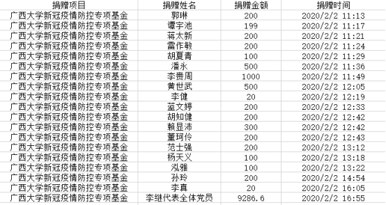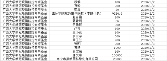 自廣西大學校友總會與教育發(fā)展基金會發(fā)布捐贈公告以來,截至2020年2月2日晚上7點,基金會共接受捐贈19筆,具體明細如下: