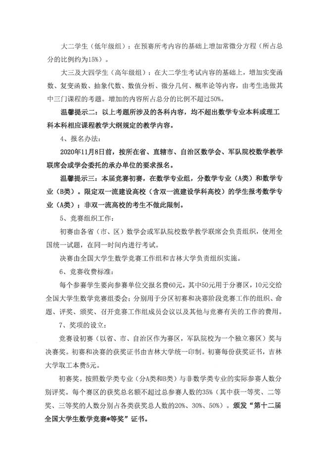 第十二屆全國大學生數學競賽包括分區賽和決賽兩個階段,參賽費每人60元。