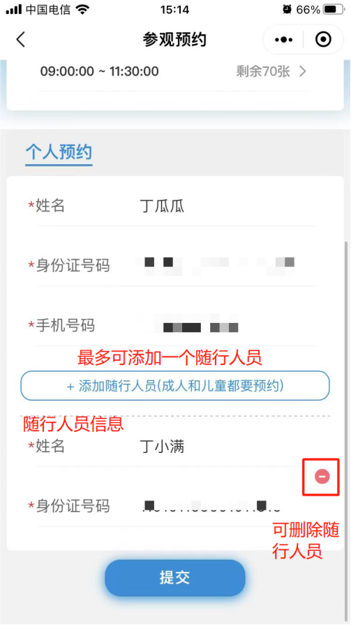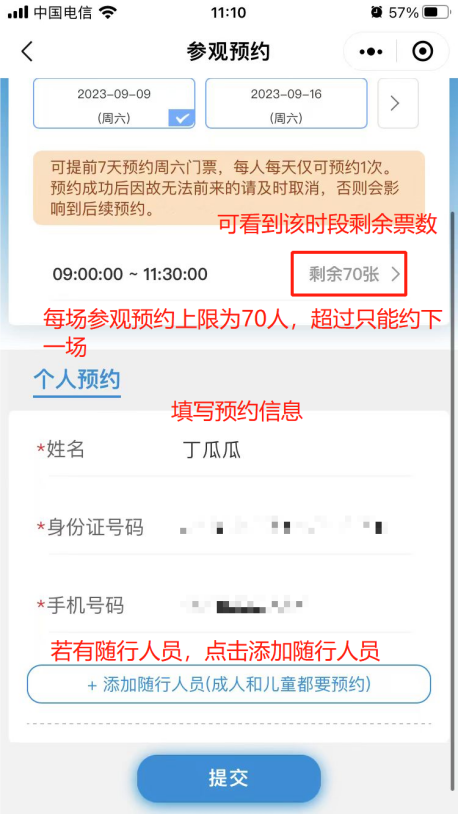 6. 填寫預約人和隨行人員信息,每場參觀預約上限位70人,超過人數無法預約,只能約下一場次。