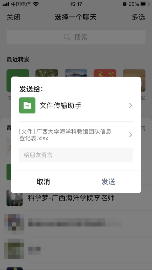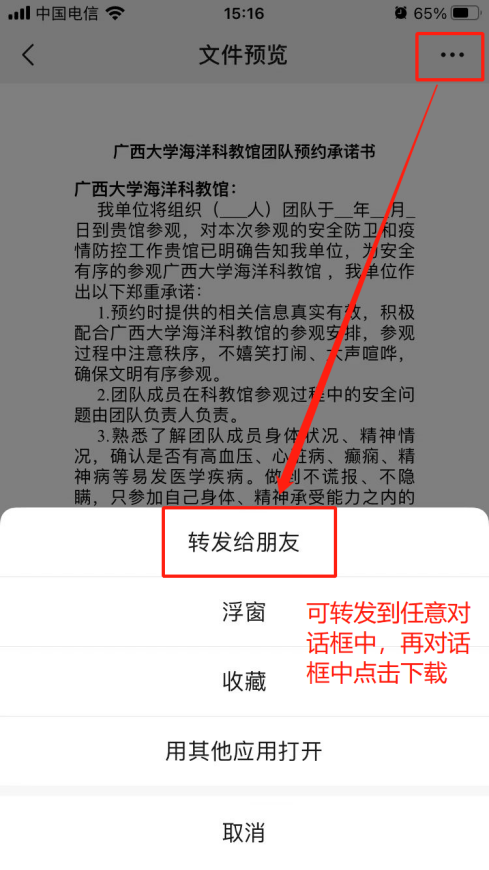 5. 預約申請提交后,可先準備團隊預約承諾書和人員登記表,點擊“廣西大學海洋科教館團隊預約承諾書”或“廣西大學海洋科教館團隊信息登記表”,轉發至微信對話框中(推薦“文件傳輸助手”),下載后按要求填寫預約承諾書和人員登記表內容,填寫完成后發送給館內工作人員,由工作人員審核。