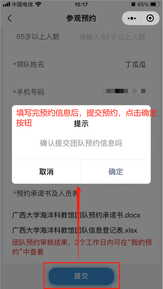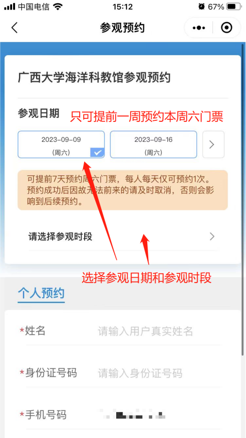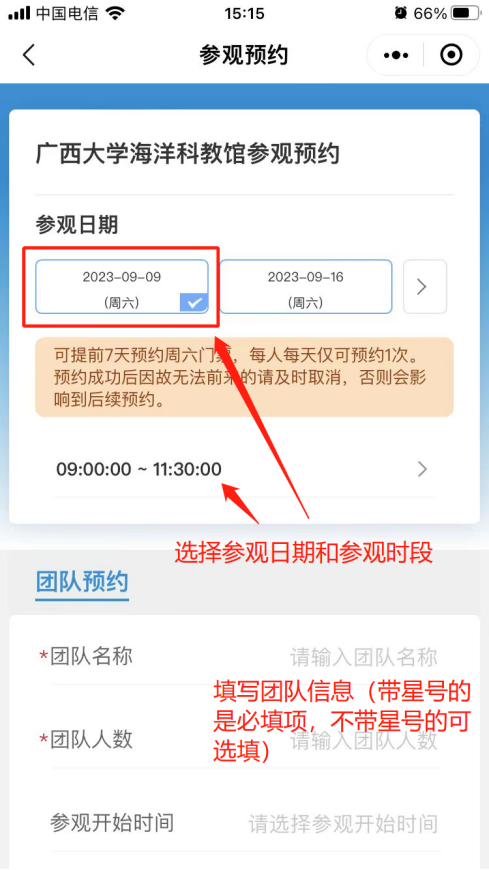 3. 預約界面選擇參觀日期,參觀時段,填寫預約信息(帶星號的是必填項,不帶星號的可選填)。
