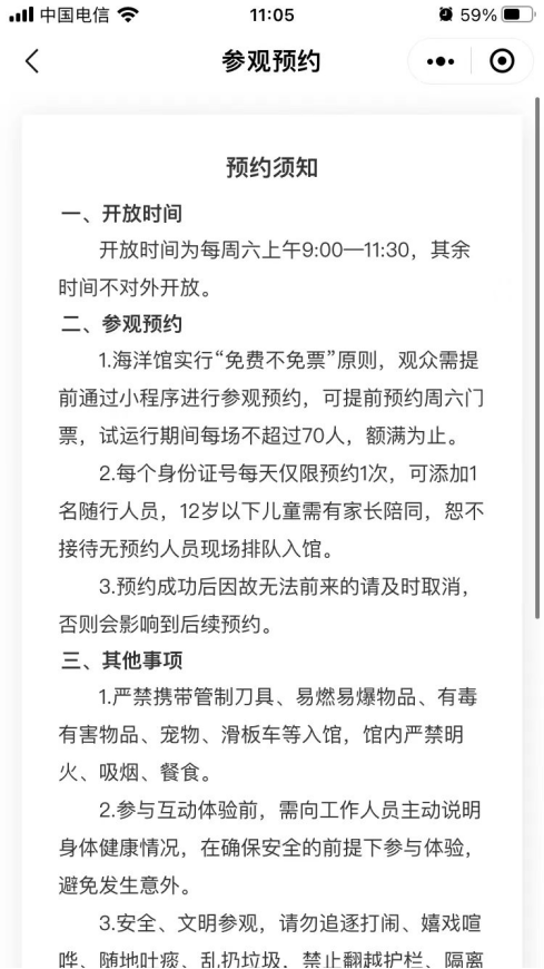 1.海洋館實行“免費不免票”原則,觀眾需提前通過小程序進行參觀預約,可提前預約周六門票,試運行期間每場不超過70人,額滿為止。