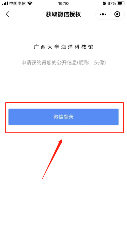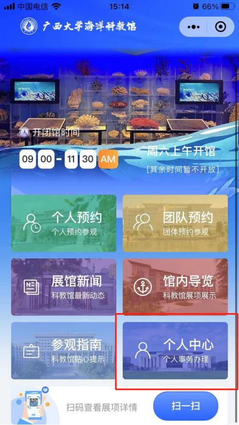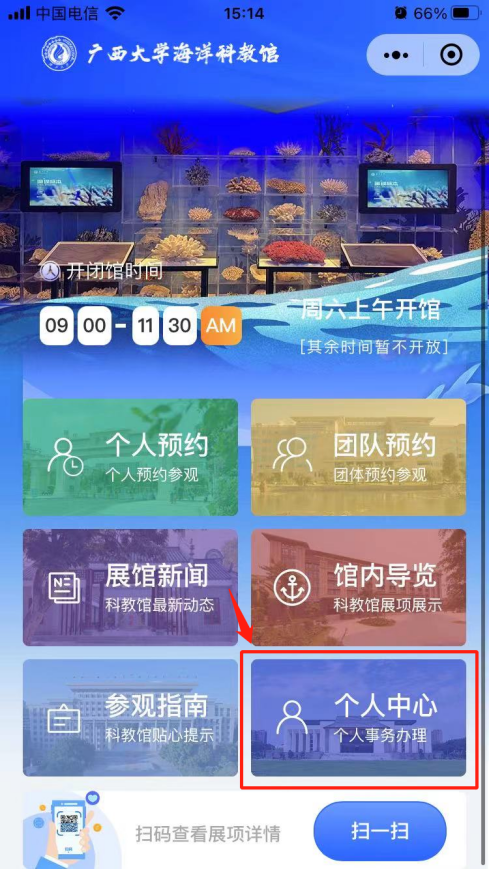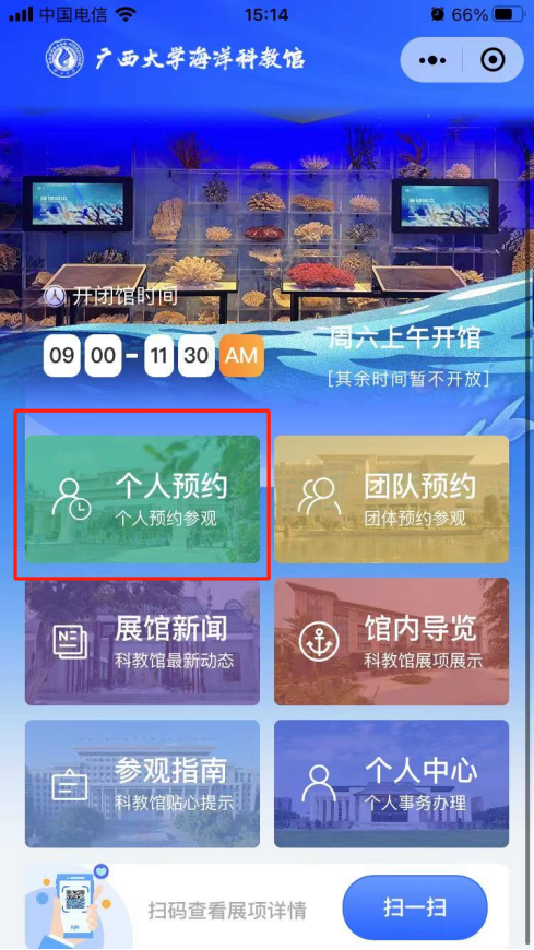 1. 微信搜索“廣西大學海洋科教館”小程序,點擊進入或掃二維碼。