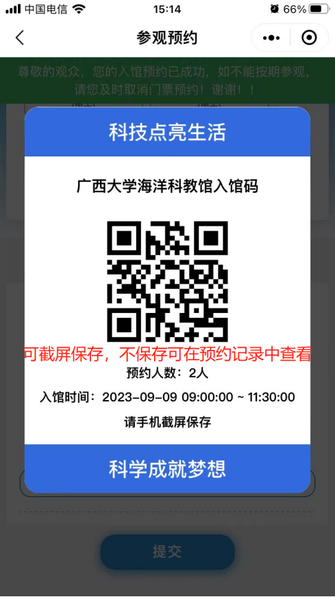 7. 提交預約信息,點擊確定按鈕,預約成功,生成預約二維碼,入館時需向館內工作人員出示預約二維碼,掃碼進館。