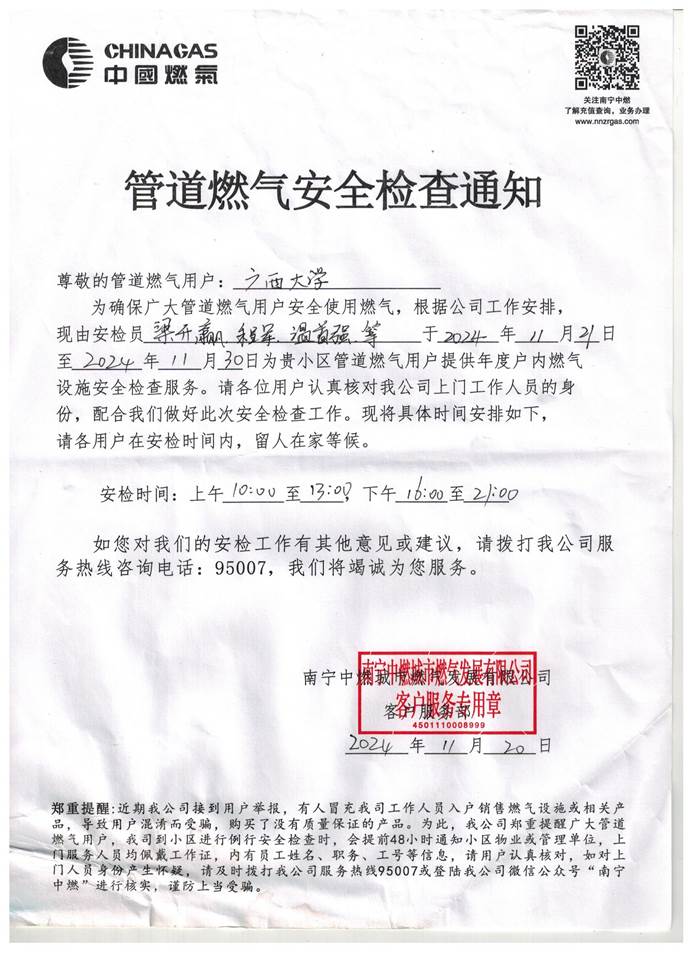 為保障校內燃氣用戶的用氣安全,后勤基建處聯系南寧中燃城市燃氣發展有限公司開展本年度第二次管道燃氣入戶安全檢查,請各住戶于2024年11月21日至11月30日期間做好相關配合工作,現將具體通知如下: